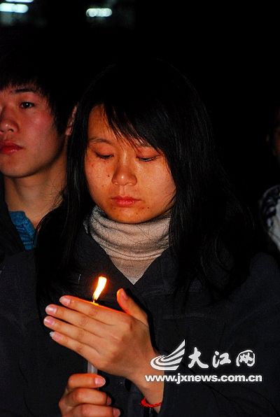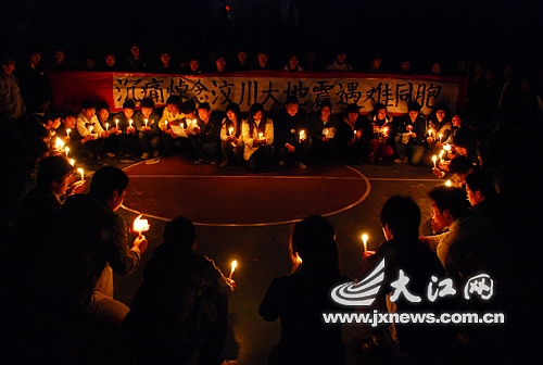 記者在現場看到,數百名同學有的手拿蠟燭,有的手拿小白花,有的手舉大橫幅,在省體校的廣場中央圍成一個大圈,當體苑社區干部提議大家一起為汶川大地震遇難同胞默哀一分鐘時,同學們都閉上了眼睛,默默地為地震中遇難的同胞們祈禱。隨后,同學們又在老師的帶領下共同朗誦了詩歌,以紀念遇難的同胞,“當災難阻斷歸路,我們彼此相依!面對災難,團結就是力量……”頓時,同學們鏗鏘有力的朗讀聲響徹整個校園。
