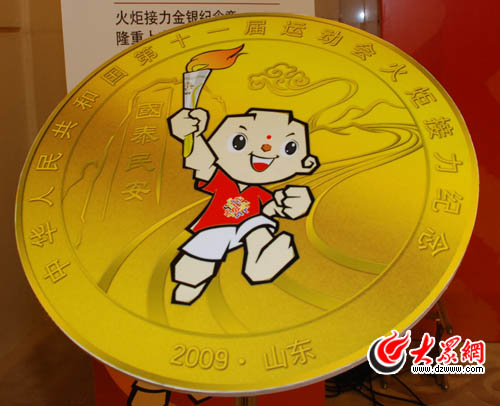 “火炬接力紀念章”采用99.99%純金及99.9%純銀打造,正面以十一運會吉祥物手持火炬奔跑為主要圖案,背景為泰山圣火采集的盛事景象;該產品設計大方典雅,制作工藝精良,紀念意義重大,發行量稀缺,為不可多得的收藏珍品。象征如意吉祥的“火炬接力紀念章”面向全國限量發行,中國民生銀行各營業網點及十一運會特許零售店均有售。