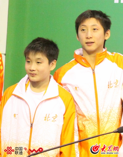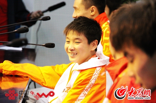 大眾網-山東聯通3G聯合報道(記者 趙爾印)10月8日晚結束的第十一屆全運會男子雙人十米臺跳水決賽中,北京的年輕組合林躍和曹緣憑借497.61 高分獲得金牌,領先亞軍解放軍周呂鑫、王健凱組合十多分。賽后,當被問及是否聽見了來自觀眾席上的噓聲時,林躍告訴記者:“聽到了場外有些噪音,但我們當時只管做好自己的動作,認真比賽就行了。”而同時,冠軍組合中年僅14歲的曹緣因其靦腆、率真卻在賽后逗樂了所有記者。