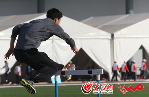 開始跨欄訓練的劉翔顯然沒有真正進入狀態。不多久,他脫下了灰色外套,換上了釘鞋,開始了真正的跨欄訓練。