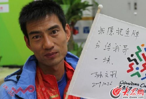 大眾網-聯通3G聯合報道10月26日訊(記者 隋喬 趙新婷 楊博) 獲得全運會男子3000米障礙和男子1500米雙料冠軍的山東選手孫文利最大的心愿是什么?今天晚上,目睹了帶傷上陣的哥哥孫文勇在男子5000米決賽沖刺階段,被其他選手反超,與獎牌失之交臂的遺憾一幕后,弟弟孫文利淚水在眼眶里打轉。在全運官網大眾網奧體演播間等待哥哥賽后尿檢后,一起做客《明星訪談室》節目的孫文利一個勁地說:“我哥太不容易了,我哥太不容易了……”,沉思許久,他在一面全運會會旗上揮筆寫下了自己最大的心愿:“我愿把金牌分給我哥一塊!”