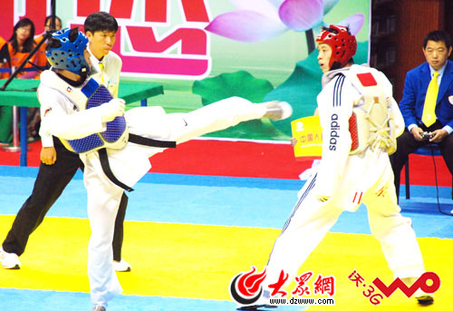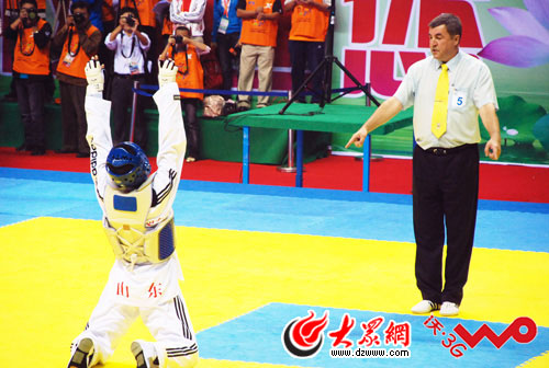 大眾網9月11日訊 十一運會跆拳道比賽今天繼續在山東滕州體育中心體育館進行。在男子80公斤級比賽中,山東選手趙林以4:3戰勝浙江選手王浩,奪得金牌。在今天的比賽中,趙林先后以8:7、3:2、2:1分別戰勝河北王廣帥、遼寧李生、解放軍朱國后進入決賽。