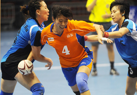 山東隊球員孫天敏(中)在比賽中進攻受阻。新華社記者 韓瑜慶攝