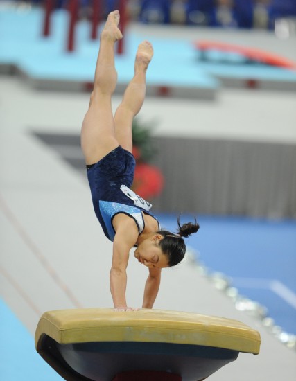 今晚的跳馬比賽實行兩跳記平均分的賽制。湖北隊的張業(yè)琳子第一個上場,盡管在第一跳中出現(xiàn)失誤,落地時沒有站穩(wěn),但第二跳張業(yè)琳子還是發(fā)揮得非常不錯,最終拿到13.000的分?jǐn)?shù)。北京隊小將王欣第二個上場,兩跳王欣都發(fā)揮的非常穩(wěn)定,得分13.900。接下來上場的是山西的鄧少婕,在第一跳中,鄧少婕發(fā)揮穩(wěn)定,拿到13.950,但在第二跳中,鄧少婕在落地時出現(xiàn)失誤,摔出場外,拿到13.825分,最終拿到13.887。第四個上場的是在資格賽中排名第一的陜西隊楊佩。她兩跳都發(fā)揮得非常穩(wěn)定,盡管第二跳在落地時稍顯不穩(wěn),但最終仍拿到14.237的分?jǐn)?shù),暫居第一。福建隊周巧紅第五個出場。第一跳周巧紅發(fā)揮非常出色,拿到14.550的高分,但第二跳中,周巧紅在落地時出現(xiàn)失誤,僅得到13.800,兩跳平均拿到14.175分。接下來出場的是來自香港的黃曉盈,兩跳平穩(wěn)落地后,拿到13.312分。山東隊的史小璐第七個出場。第一跳,史小璐在現(xiàn)場觀眾的熱烈歡呼中穩(wěn)穩(wěn)落地,得到14.550的高分,第二跳穩(wěn)定落地后,史小璐最終得到14.100的分?jǐn)?shù),位居第三。最后一個出場的是天津的蔣彤,最終拿到13.712分。