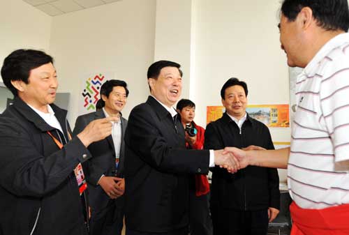 省委書記、省人大常委會主任姜異康和男子三級跳遠前全國紀錄保持者鄒振先親切握手。(齊魯晚報記者 陳文進 郭建政 攝影)