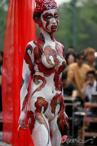 4月29日上午,在濟南舉行的迎全運會高級技能人才展示會上,一名19歲少女身穿內衣內褲,4名化妝師在其身上繪畫上了如意標志,頭飾制作成了火炬的式樣,上臺展示時,紅紗在頭部飄動 ,猶如燃燒的火焰。據化妝師介紹,此化妝造型的靈感來源于4月28日公布的全運會“如意”火炬,人體彩繪的圖案就是古時的如意。
