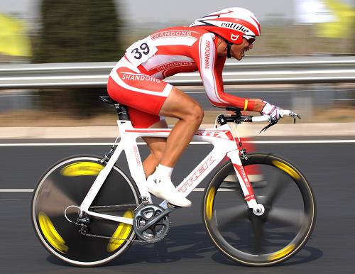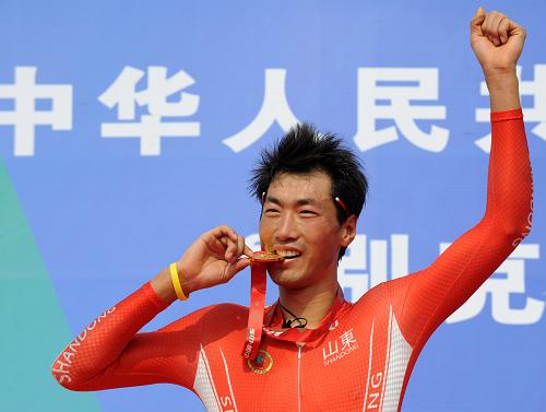 10月24日,山東隊選手李富玉在比賽中。當日,在濟南舉行的第十一屆全國運動會自行車男子公路個人計時賽的比賽中,李富玉以53分45秒928的成績奪得冠軍。