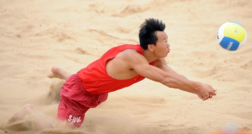 9月20日,在山東青島舉行的第十一屆全國運動會沙灘排球男子小組賽中,山東隊選手韓勝威/高方田以2比0戰勝云南隊選手劉勇/孫家國。 新華社記者王曄彪攝