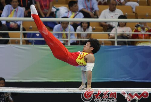 山東隊的張成龍第五個出場,張成龍今下午發揮穩定,單手轉身、身體180度旋轉,一套 動作順利完成后,張成龍拿下14.975分。第六個上場的是全能亞軍、四川隊馮喆,回環、 騰空旋轉、穩穩落地,馮喆非常出色的完成他的整套雙杠動作,砍下15.500的分數。