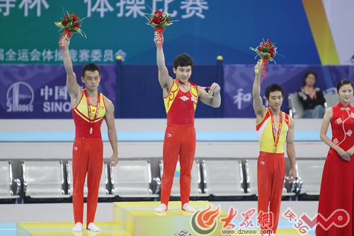 大眾網-山東聯通3G聯合報道(記者 明清 新婷 爾印 隋喬 洪棟)十一運體操比賽男女單項的比賽正在進行。男子雙杠決賽剛剛戰罷,馮喆豪奪金牌,加冕冠軍,王冠寅摘得銀牌 ,獲得第三名的是全能王滕海濱。