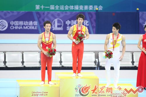 大眾網-山東聯通3G聯合報道(記者 明清 新婷 爾印 隋喬 洪棟)第十一屆全運會體操項目的比賽完美謝幕。最后一輪舉行的是男子單杠項目的比賽,經過激烈的較量, 北京奧運冠軍鄒凱憑借完美的發揮登上冠軍寶座,斬獲金牌,郭偉陽屈居亞軍,呂君海獲得季軍。