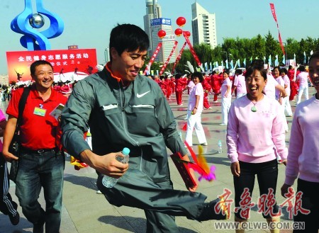 昨日,劉翔等23名奧運(yùn)冠軍現(xiàn)身濟(jì)南泉城廣場,參加“全民健身志愿服務(wù)活動”。 本報記者 戴偉 攝