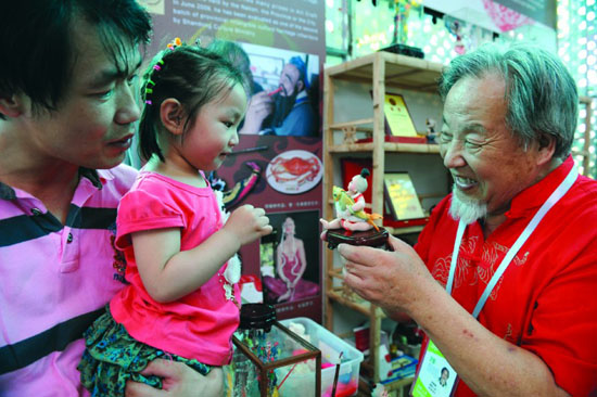 世博會山東活動周非物質文化遺產展示區內,來自濟南的面塑大師何曉錚展示他的面塑藝術。