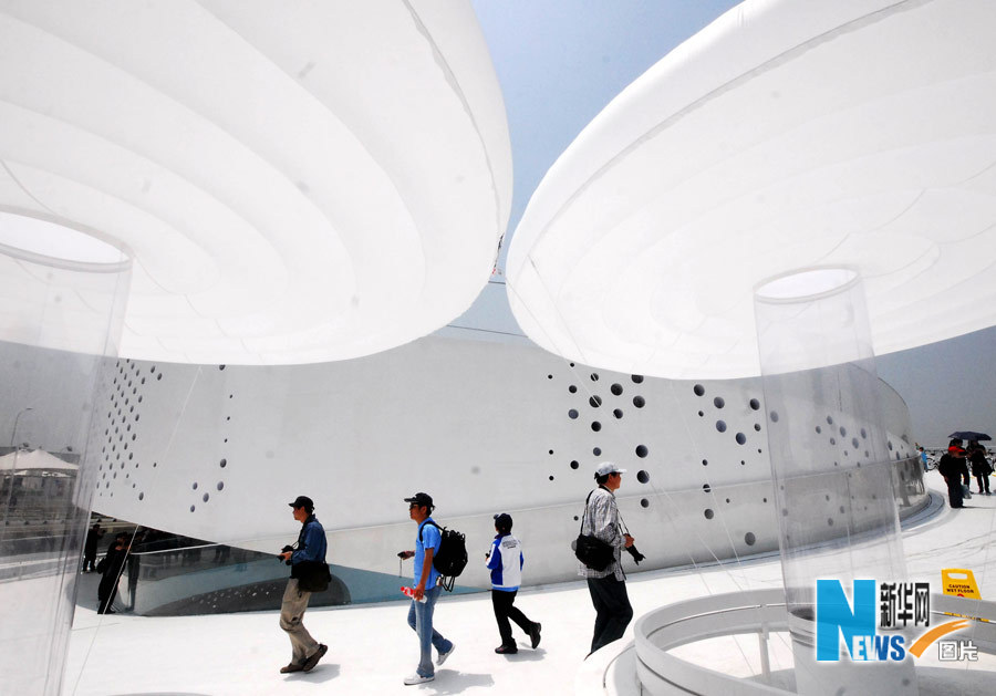 5月2日,游客從上海世博園丹麥館環保遮陽篷前走過。當日是上海世博園開園第二天,一些富有特色的展館成為游客參觀的熱點。
