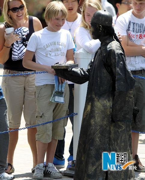 5月7日,幾位外國游客對世博園內(nèi)的真人“雕塑”很感興趣。上海世博會開幕以來,眾多外國游客興致勃勃地參觀世博園。新華社記者張明攝
