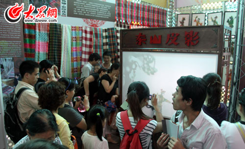 非遺展覽吸引了眾多游客,圖為游客圍在展臺周圍觀看“泰山皮影”。