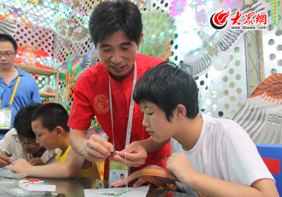 濰坊風箏的展臺前,小游客自己動手學做風箏