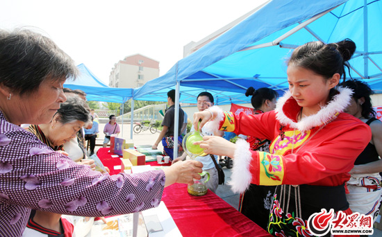 30日早上8點(diǎn)剛過,濟(jì)南南全福廣場上便迎來專程趕來品嘗北川茶的濟(jì)南市民,他們有的來自附近的小區(qū),有的驅(qū)車十幾里路從老遠(yuǎn)的西郊趕來,幾位身著羌族服裝的青年為市民倒著一杯杯濃香的北川茶。