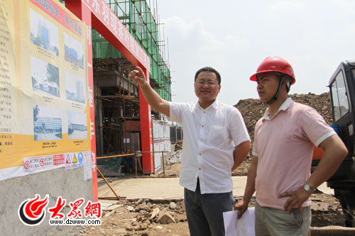 羽琨茶業總經理張偉(白衣)與施工方交流
