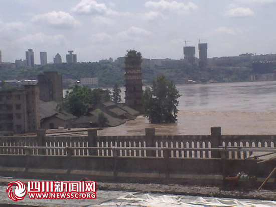 160年一遇洪峰襲擊廣安,低矮平房被淹白塔難幸免。圖片由廣安網(wǎng)友“狼跡天涯”提供,拍攝于2010年7月19日14點40分。
