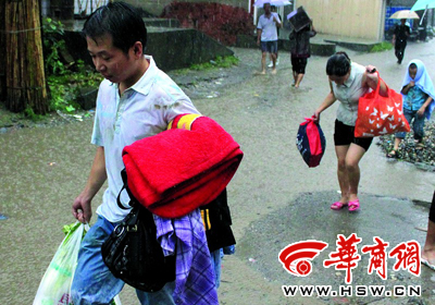 下午5時34分,張模安也搬起了東西,他住的是一棟三層小樓,正和幾個兄弟將電冰箱、洗衣機等大件電器往二樓搬。他說,照這樣下去,要不了多久一樓就沒法呆了。在他家門前,記者見到了心石村村委會的仇主任,滿頭雨水的他正在挨家挨戶地通知緊急撤離,“現在是動員老弱病殘離開。”