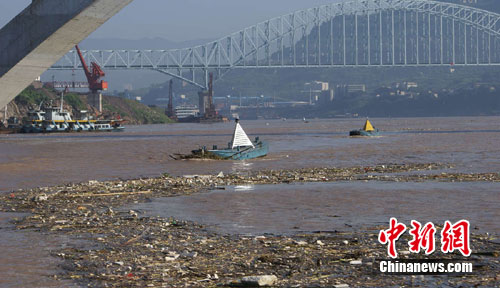 中新網重慶7月21日電 (郭虹 朱治宇)21日,成片的渣草隨著洪峰流入長江萬州水域,幾乎占據了半個江面。記者看到長江重慶航道局的4艘航標艇在江面不停穿梭,清理懸掛在航標上的渣草。