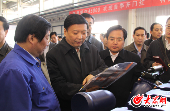 在萬家團圓喜迎新春的時刻,濰柴動力的車間里依然一派繁忙景象。上午10時許,姜大明省長在山東重工集團董事長譚旭光的陪同下,來到了山東重工旗下的濰柴動力新區二號工廠。在新投產的生產車間,姜大明同在場的工人親切握手,并向他們及家人拜年。當聽到濰柴動力的產品全面旺銷,1月份產出45000臺,銷售收入達到8億元,實現了元月開門紅,姜大明連聲稱贊。姜省長叮囑,企業就要一切以市場需求為重心。節日加班的員工生活你們一定要安排好,要做好大家的思想工作,同時要維護好員工們的切身利益。