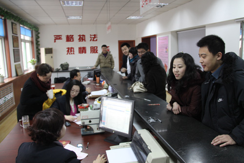 “我跟她相戀3年了,非常想在春節和情人節重合這一天登記結婚,但想到春節是節假日本來沒抱什么希望”,14號一早從德州老家開車趕到濟南和女友高芳前來登記的邢曉明開心地說,“后來我們都從媒體上看到濟南2月14日這天可以預約登記的消息,我們就不約而同地想到要在今天趕喜慶登記”。跟記者說完,邢曉明把自己和女友的身份證,戶口本等證件交到了登記處工作人員劉剛的手中,劉剛核對相關信息后認為他們的手續齊全,就轉交給了電腦前負責信息錄入的同事。