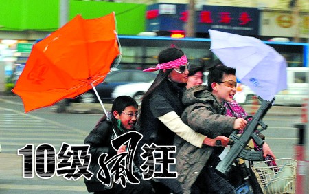 26日下午4時(shí)30分許,濟(jì)南市區(qū)狂風(fēng)大作,最大風(fēng)力達(dá)10級(jí),為省城十年來(lái)最大。圖為一女士騎車帶著剛放學(xué)的學(xué)生在風(fēng)中艱難行進(jìn)。本報(bào)記者 徐延春 攝