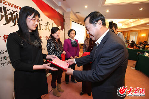 山東人民出版社社長金明善為眾眾微博小說大賽二等獎獲得者頒獎。(大眾網記者 曹亮 攝)