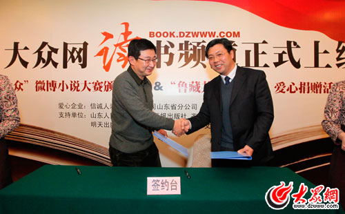 大眾網副總編輯曲濤與明天出版社副總編輯賈廣勝簽約(大眾網記者 曹亮 攝)