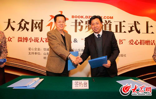 大眾網副總編輯曲濤與齊魯書社副總編輯昝亮簽約(大眾網記者 曹亮 攝)