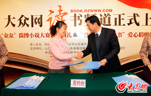 大眾網(wǎng)副總編輯曲濤與山東人民出版社副總編輯丁莉簽約