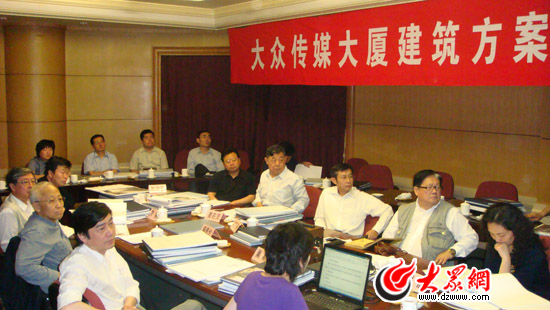 2009年5月8日,大眾傳媒大廈方案招標評審會在新聞大廈東岳廳舉行。圖為大眾報業集團黨委副書記、社長許衍剛與國家勘察設計大師劉力在大眾傳媒大廈方案招標評審會現場。