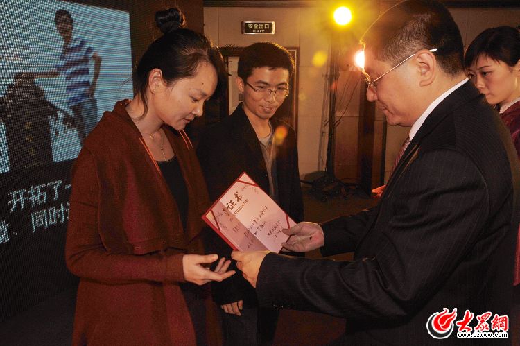 大眾網(大眾傳媒股份有限公司)總編輯朱德泉為業務能手頒獎。(記者 郭建政 曹亮 攝)