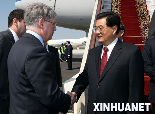 5月8日,應俄羅斯總統(tǒng)梅德韋杰夫邀請,中國國家主席胡錦濤抵達莫斯科,出席俄羅斯紀念衛(wèi)國戰(zhàn)爭勝利65周年慶典。這是胡錦濤在機場受到俄羅斯外交部副部長博羅達夫金等熱情迎接。新華社記者姚大偉攝