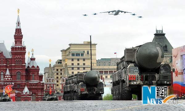 5月6日,在俄羅斯首都莫斯科,俄羅斯“白楊-M”彈道導彈在彩排中通過紅場。