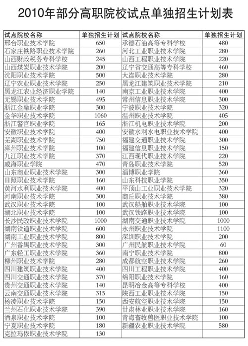 據了解,為探索高考招生制度改革,突出高職教育特色,完善高等教育多元化選拔機制,從2007年開始,教育部批準在江蘇、浙江、湖南、廣東等4省8所高職示范學校進行單獨招生試點。2008年擴大到8省區20所。2009年安排33所高職示范校單獨招生,招生9240名。今年,單獨招生院校的范圍擴大到73所,計劃招生25505名。