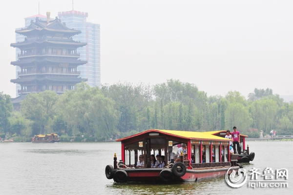 來到大明湖景區,乘船采訪報道