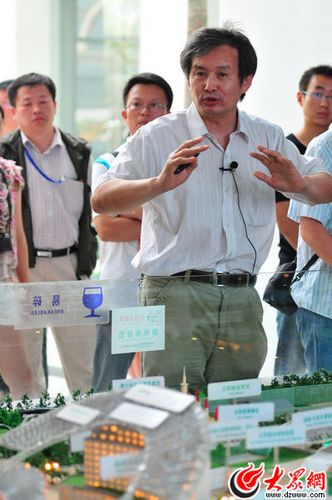 黃鳴為采訪團(tuán)講解“中國(guó)太陽(yáng)城”的規(guī)劃(記者 韋國(guó)騫 攝)