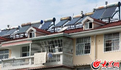 剛進德州城區,我們便發現一個非常有趣的現象——道路兩旁的樓房屋頂上密密麻麻安裝了許多太陽能熱水器。并且越接近太陽谷,各居民樓上的太陽能采光板便越多。據介紹,太陽能熱水器在老城區的普及使用率已達90%,新城區幾萬戶幾乎達到了100%。