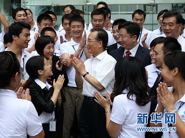 8月20日,溫家寶參觀迅雷網(wǎng)絡(luò)技術(shù)有限公司后,與青年科研人員親切交談。新華社記者 劉衛(wèi)兵 攝