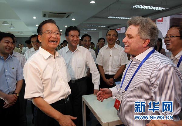 8月20日,溫家寶在中國(深圳)設(shè)計(jì)之都創(chuàng)意設(shè)計(jì)產(chǎn)業(yè)園調(diào)研時(shí),與一家美國創(chuàng)意企業(yè)負(fù)責(zé)人交談,了解中外企業(yè)合作研發(fā)和生產(chǎn)情況。新華社記者 劉衛(wèi)兵 攝