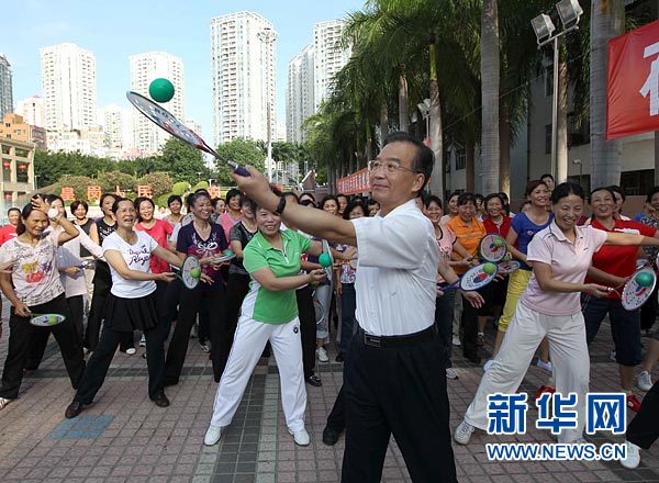 8月21日,溫家寶來到深圳皇崗社區(qū)看望居民時(shí),與居民們一同做柔力球運(yùn)動(dòng)。新華社記者 劉衛(wèi)兵 攝