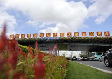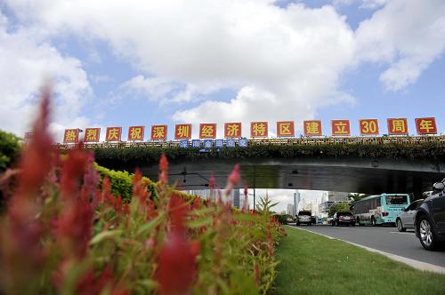 在深南大道深南金田立交橋上設立的“熱烈慶祝深圳經濟特區建立30周年”標語