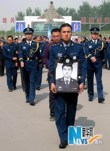 5月12日,濟空航空兵某師官兵為馮思廣烈士送行。5月6日晚,空軍駐濟南某航空兵師飛行員馮思廣和中隊長張德山在駕駛某型飛機時遭遇發動機空中停車,為避免飛機墜落在濟南市人口稠密地區,馮思廣把個人生死置之度外,和張德山一起果斷改變飛行軌跡,自己卻因錯過跳傘最佳時機,壯烈犧牲。新華社發(申進科攝)