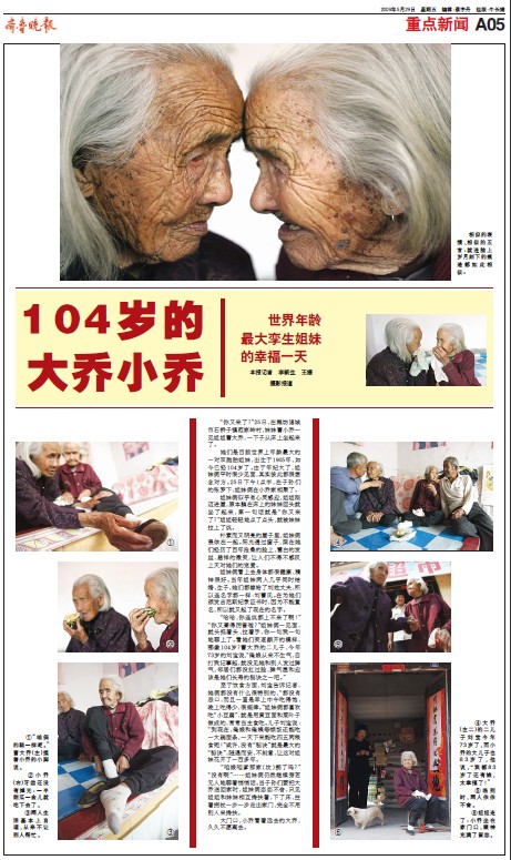 《世界年齡最大孿生姐妹大喬小喬》、《104歲的大喬小喬——世界年齡最大孿生姐妹的幸福一天》 (齊魯晚報 記者:王媛、李新生 編輯:宋國慶、蔡宇丹)