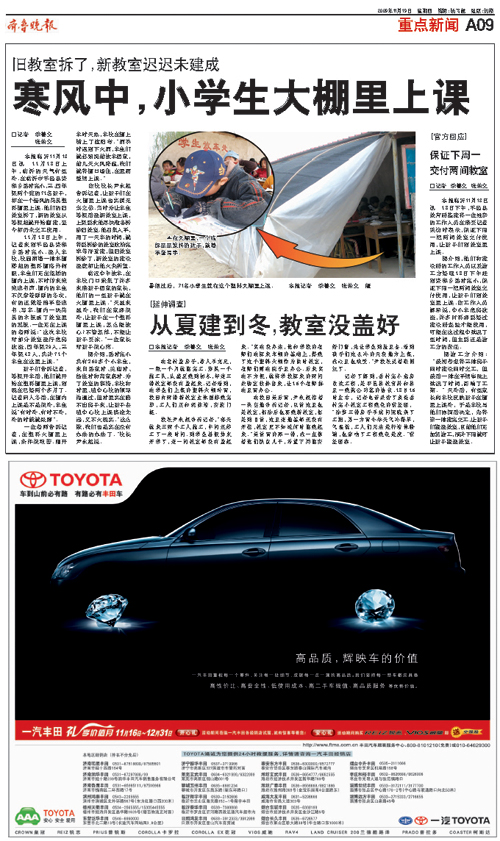 《天寒地凍 大棚上課》《寒風(fēng)中 小學(xué)生大棚里上課》《71名小學(xué)生昨搬進(jìn)新教室》 (齊魯晚報(bào)記者:季善文、張希文 齊魯晚報(bào)編輯:呂華遠(yuǎn)、楊飛越、王世新)