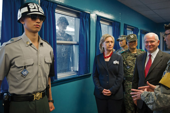 近日,美國國務卿希拉里和國防部長蓋茨一起探訪韓朝邊界板門店
