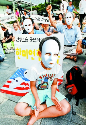 韓國民眾在首爾美國大使館附近示威抗議軍演
